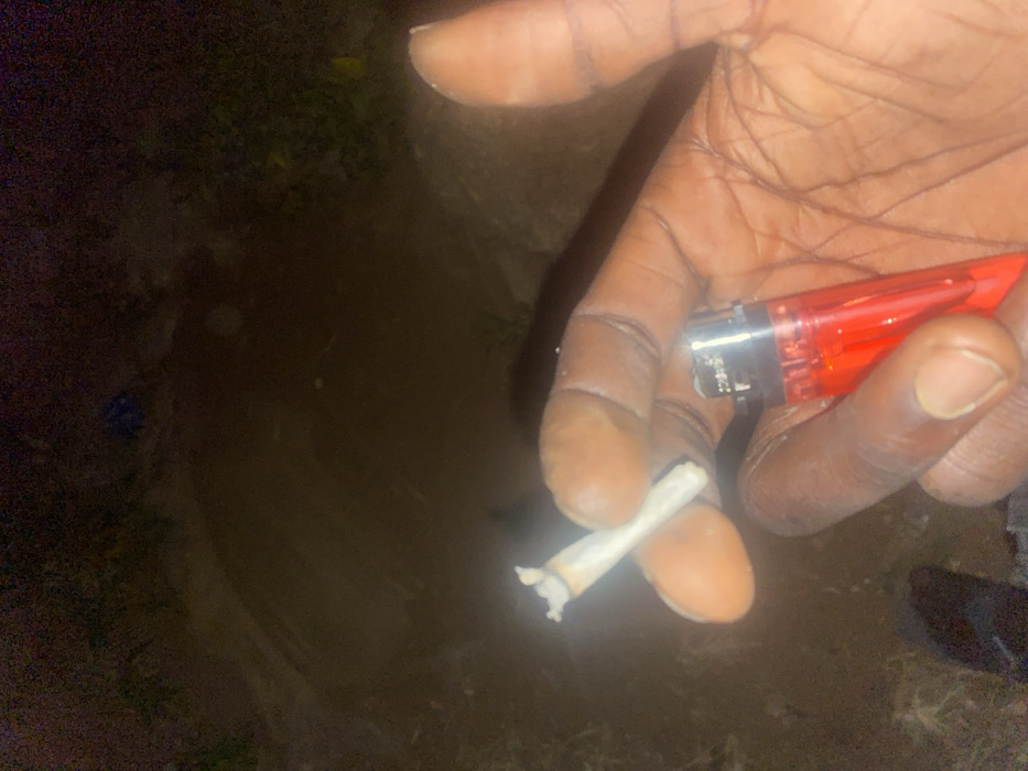 A hand holds a lit cigarette and a red lighter in a dark outdoor setting. The cigarette is partially smoked, with the lit end visible. The hand is dark-skinned and displays visible veins. The lighter is translucent red, showing its internal mechanism. The background is blurred and appears to be dirt and grass. The light is dim, emphasizing the glowing cigarette.