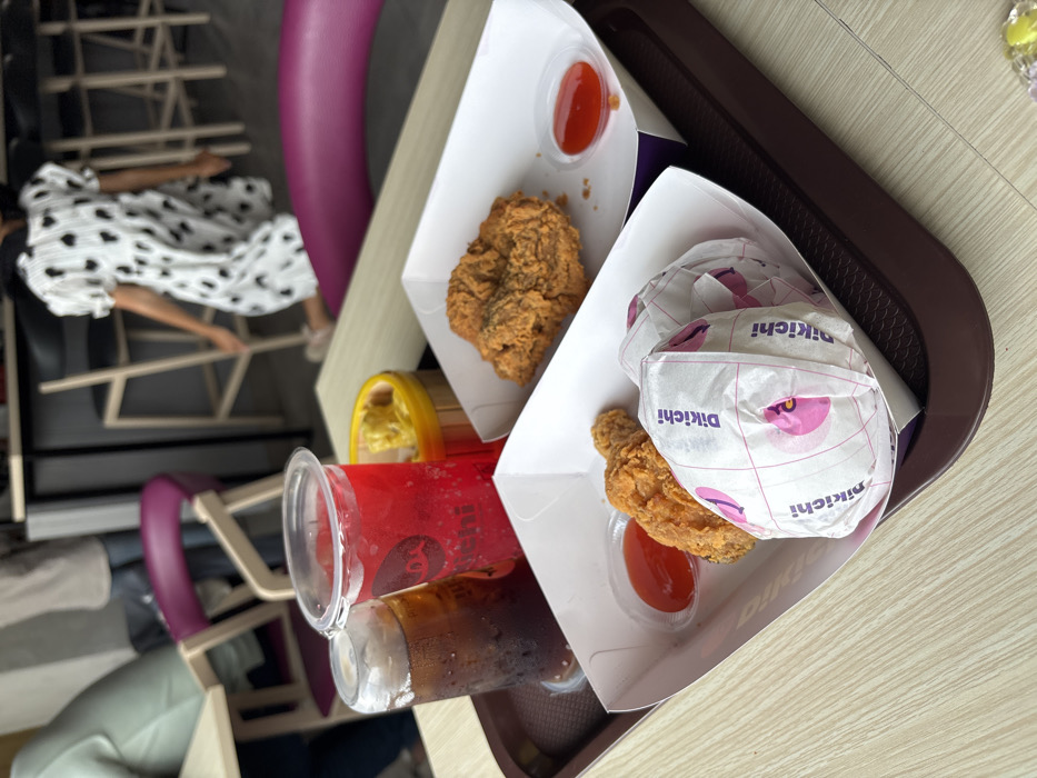 On a brown tray sits a meal: two containers hold fried chicken pieces, one unwrapped and the other encased in Dikichi-branded paper. Each container also has a small dipping sauce cup. Two plastic cups containing colored drinks stand next to the chicken. A purple chair and a white chair can be seen in the background.