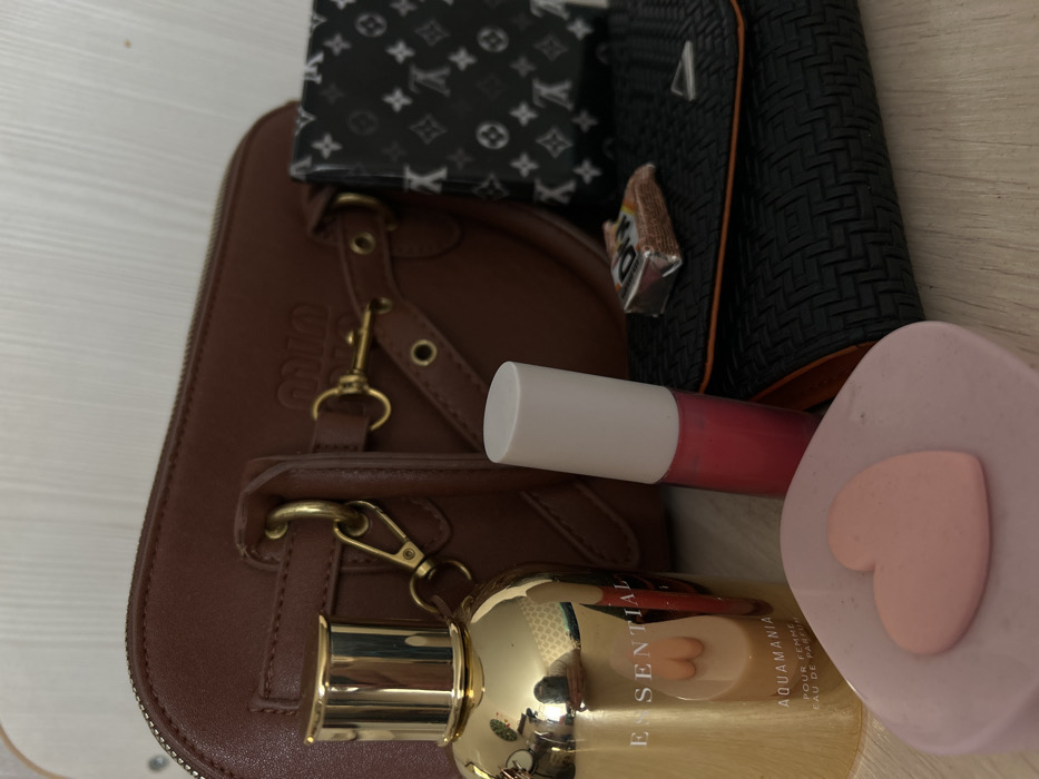 The scene displays an arrangement of personal effects on a light-colored horizontal surface in Chaikovsky, Russia. In the foreground, a light pink heart-shaped object rests on a square-shaped pink base. Behind this, a golden, cylindrical bottle of "ESSENTIAL AQUAMANIA POUR FEMME EAU DE PARFUM" is positioned. To its right, an upright transparent tube containing bright pink liquid, capped with white, is visible. Further to the right, a black textured wallet with a triangular metallic emblem is present, topped by a small, partially unwrapped chocolate candy, potentially bearing the brand "BAFOX". Behind the textured wallet, a black accessory featuring the grey Louis Vuitton monogram pattern is visible. Dominating the background is a brown leather or faux leather handbag with "Miu Miu" branding, adorned with gold-colored hardware including a zipper, clasps, and rings. The background consists of a plain light-colored vertical surface.