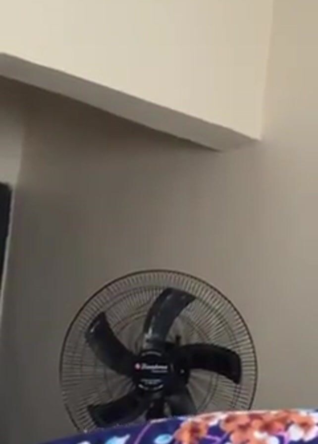 The camera points up at a beige wall, a partial view of a shelf jutting out from the wall, and a black stand-up fan. The fan is on and running. The bottom edge of the frame has a floral patterned blanket.