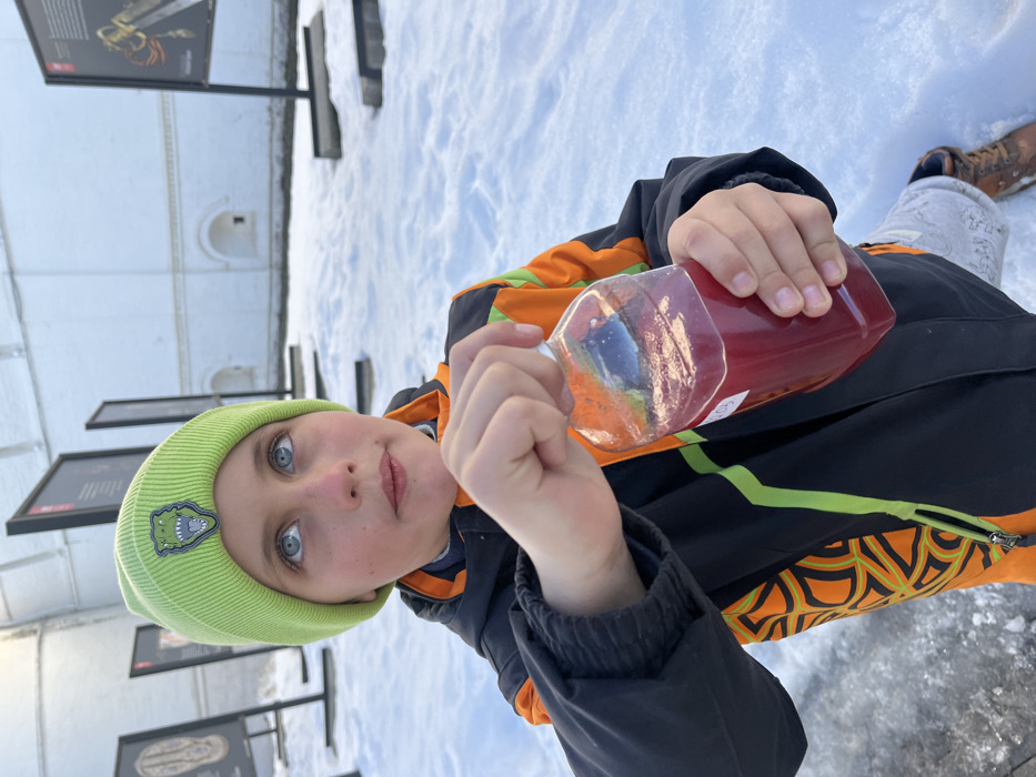 A young male individual, approximately 7-10 years old, is depicted outdoors in Ново-Никольское, Russia, in a snow-covered environment. He is wearing a neon green ribbed beanie with a green dinosaur head patch and a multi-colored winter jacket with black, orange (featuring a geometric pattern), and neon green elements. His blue eyes are directed upwards and slightly to his right. He holds a clear plastic bottle, approximately three-quarters full of a dark red liquid, with his right hand supporting the base and his left hand manipulating the cap. A white label with "103" is visible on the bottle's side. The ground is covered in a layer of snow. In the background, multiple dark-framed outdoor display panels stand erect in the snow, exhibiting textual and graphic information, including what appears to be an artifact on one panel to the far right. Behind these panels, a large, light-colored architectural structure, consistent with a fortified wall featuring recessed arches or windows, is visible. The scene is brightly lit, indicating daytime conditions.
