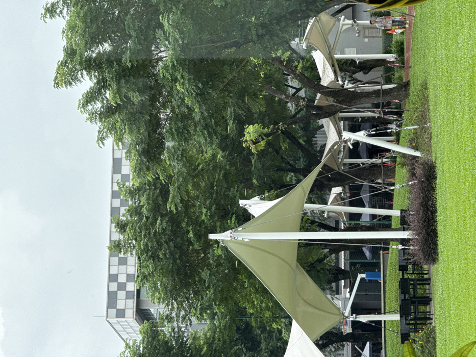 The image captures an outdoor public green space or plaza in District 1, Ho Chi Minh City, Vietnam, under an overcast sky. In the background, the upper portion of Saigon Centre Tower 2 is visible, characterized by a prominent grey and white checkerboard pattern on its facade. Dense green trees are scattered throughout the mid-ground and background, partially obscuring other structures. The mid-ground features several modern, light-colored (off-white/pale green) tension fabric canopies, each supported by a central white pole and secured by cables. Under one canopy on the left, a dark-colored outdoor seating area with multiple tables and chairs is arranged on short green grass. A small patch of dark reddish-purple shrubbery is positioned between two canopies in the central mid-ground. To the right, a reddish-brown pathway or track curves through the grass. A single male individual is observed walking on this pathway, moving away from the viewer. He wears a light-colored shirt and dark pants, and carries two white and orange objects, possibly flags or signs. Small, colorful pennants are attached to supports adjacent to the pathway, and a yellow marker is partially visible on the path. The extreme foreground contains blurred green and yellow foliage.