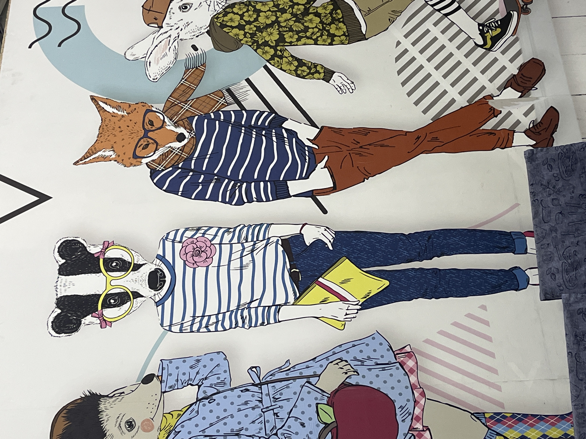 The image displays a large, vivid mural or graphic print on a vertical surface, situated in Ново-Никольское, Russia. The artwork depicts four anthropomorphic animal figures dressed in modern clothing, arranged horizontally. From left to right: A hedgehog figure, partially visible, wears a blue polka-dot coat over a yellow top, holding a red apple-shaped purse. Its right hand is near its chin. Adjacent is a badger character, distinct with black and white facial stripes, yellow-framed glasses adorned with pink bows, a blue and white striped shirt featuring a pink fabric flower brooch, dark blue jeans, and red shoes. It holds a yellow clutch bag in its left hand. Next, a fox figure with orange-brown fur and dark-rimmed glasses is dressed in a dark blue and white striped shirt, a brown plaid scarf, reddish-brown pants, and brown shoes, with hands in its pockets. The fourth figure, a white rabbit, is partially visible on the right. It wears a brown cap, an olive-green floral hooded top, black and white striped socks, and black sneakers, standing on a visible skateboard. The background is predominantly white, featuring abstract geometric designs including a black chevron at the top, light blue curved shapes, black wavy lines, pink diagonal stripes, and a grey striped pattern. A dark blue, textured surface runs horizontally along the bottom edge of the image, positioned in the foreground.