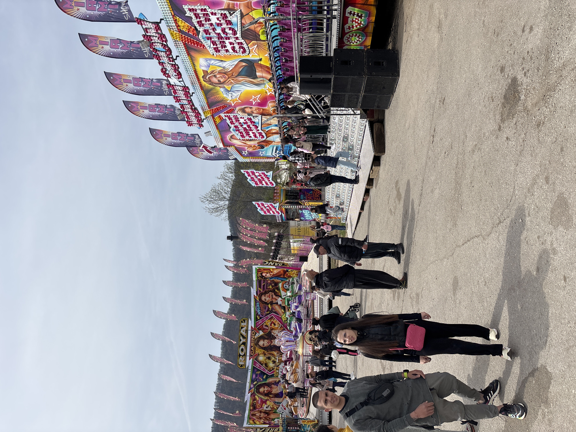 fairground in Botevgrad, Bulgaria. People are standing in front of a fairground ride. The ride is decorated with images of women and gambling-related motifs. Flags with writing are attached to the ride's top. Speakers are present behind the ride. The ground is concrete. The sky is overcast.