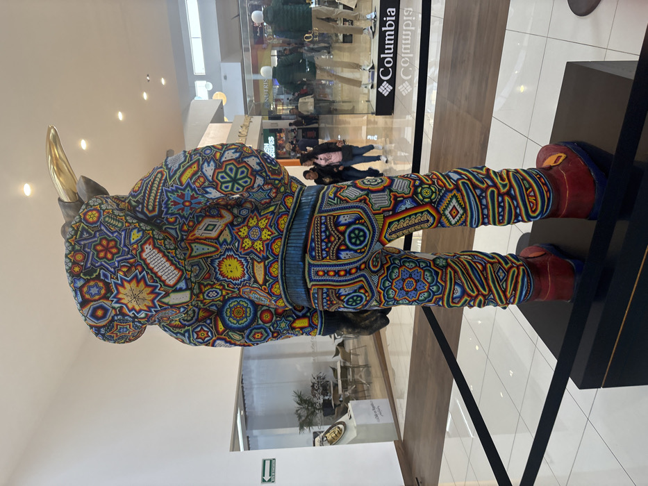 A vividly patterned bull sculpture stands inside a mall. The sculpture, adorned with intricate geometric designs and vibrant colors, features a golden horn. Shoppers and stores, including a Columbia outlet, are visible in the background. The bull stands on a black pedestal near a tiled floor and a glass wall.
