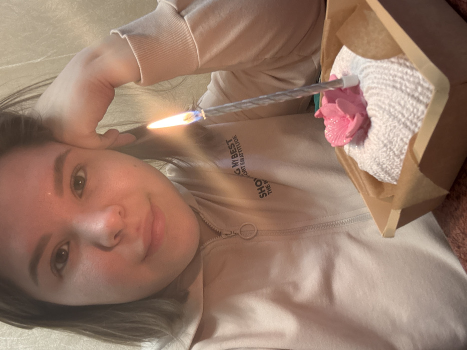 A young adult female, with light skin, brown hair, and dark eyes, is depicted in a close-up, selfie-style photograph in Nizhnekamsk, Russia. She wears a light beige or off-white zippered hoodie, with partial text visible on the chest reading "ING MY BEST" and "ORT IS AN ATTITUDE". Her left hand supports her head on the left side of the frame, and she presents a subtle, closed-mouth smile while looking directly at the viewer. In the lower right foreground, a lit, twisted silver birthday candle with an orange and blue flame is prominently featured. This candle is inserted into a small, round, white textured object, resembling a miniature cake or dessert, topped with a distinct pink floral decoration. The object rests within a light brown, possibly cardboard, rectangular container lined with brown paper. The background consists of a plain, light-colored wall. The scene is warmly lit, with light originating from the candle flame and a broader light source illuminating the subject's face.