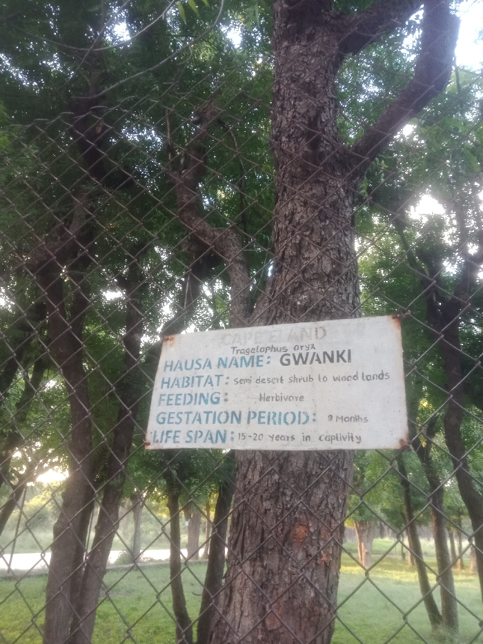 The scene is set in Gandu Albasa, Nigeria, depicting an outdoor area, likely within an animal enclosure or park. A weathered, rectangular white sign with dark lettering is affixed to the rough, dark brown bark of a prominent tree trunk, positioned slightly right of the frame's center. The sign displays information about the "CAPE ELAND (Tragelaphus oryx)", including its "HAUSA NAME: GWANKI", "HABITAT: semi desert shrub to wood lands", "FEEDING: Herbivore", "GESTATION PERIOD: 9 Months", and "LIFE SPAN: 15-20 years in captivity". The top edges of the sign show signs of rust. A dark gray chain-link fence with a diamond pattern is prominently visible in the foreground, extending across the entire image and partially obscuring the view of the trees and background. Beyond the fence and the central tree, several other trees with similar rough bark and dense green foliage are visible, suggesting a wooded or natural environment. The ground in the background appears to be covered with green grass or low vegetation. Natural light filters through the tree canopy, creating bright areas and dappled shadows. No individuals or live animals are visible in the frame.