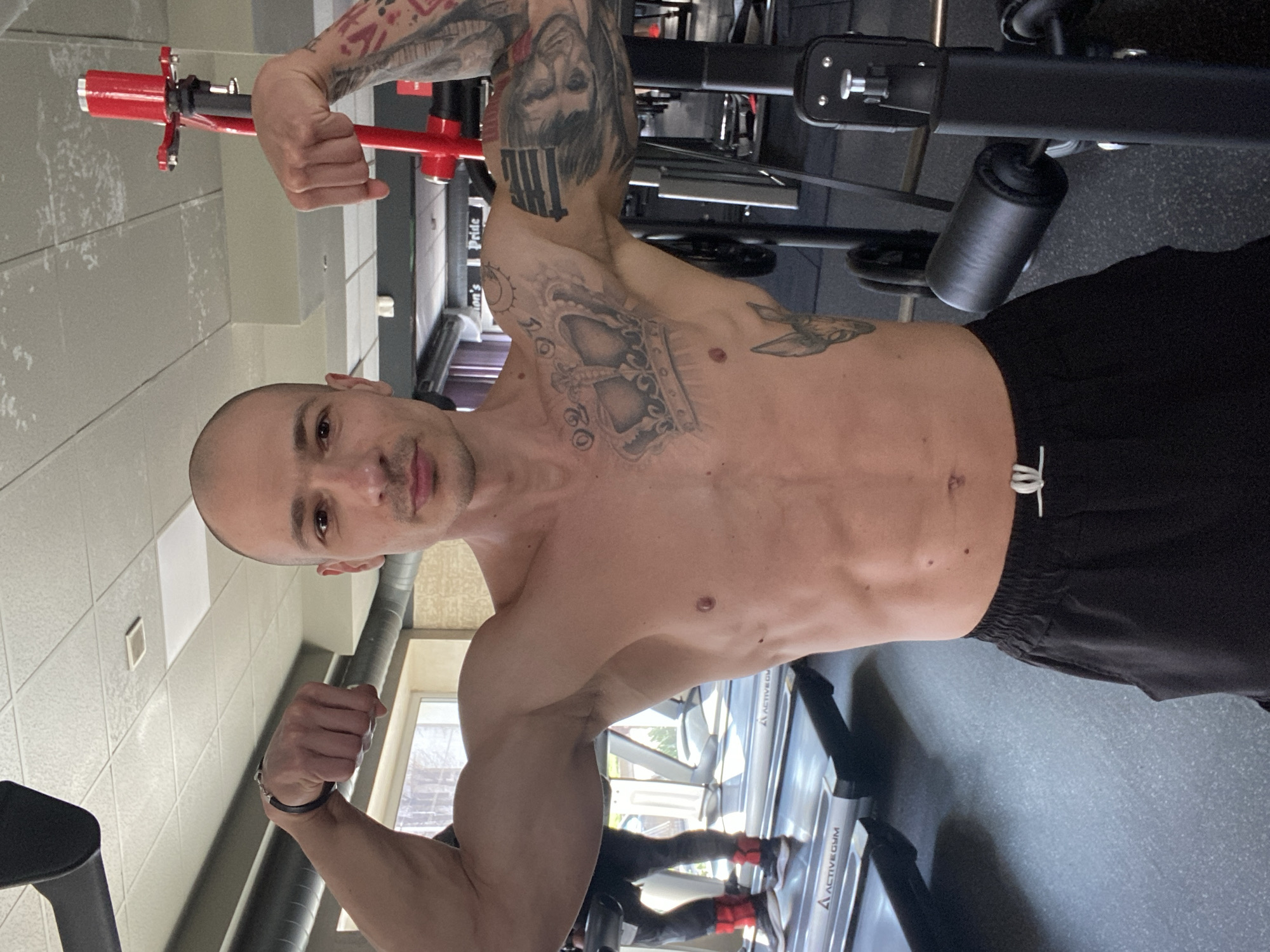 A shirtless man with a shaved head and extensive tattoos on his arms and torso poses in a gym