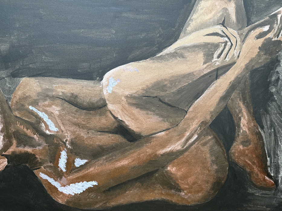 The image is a photograph of an oil or acrylic painting on canvas. The painting depicts a seated, nude human figure, cropped from the upper chest to just above the feet, with the head partially visible at the top. The figure's skin tone is rendered in shades of brown and tan, exhibiting visible brushstrokes. The figure is posed with its right leg bent and drawn towards the body, and its left arm is visible, crossing the torso, with the hands clasped around the bent knee. Abstract white and light blue paint marks are present on the upper left chest and shoulder area, and a smaller light blue mark appears on the right knee. The background is a uniformly dark, indeterminate color, likely black or very dark grey, with textural variations from the brushwork. The figure appears to be seated on a dark, textured surface. This painting is located in Khimki, Russia.