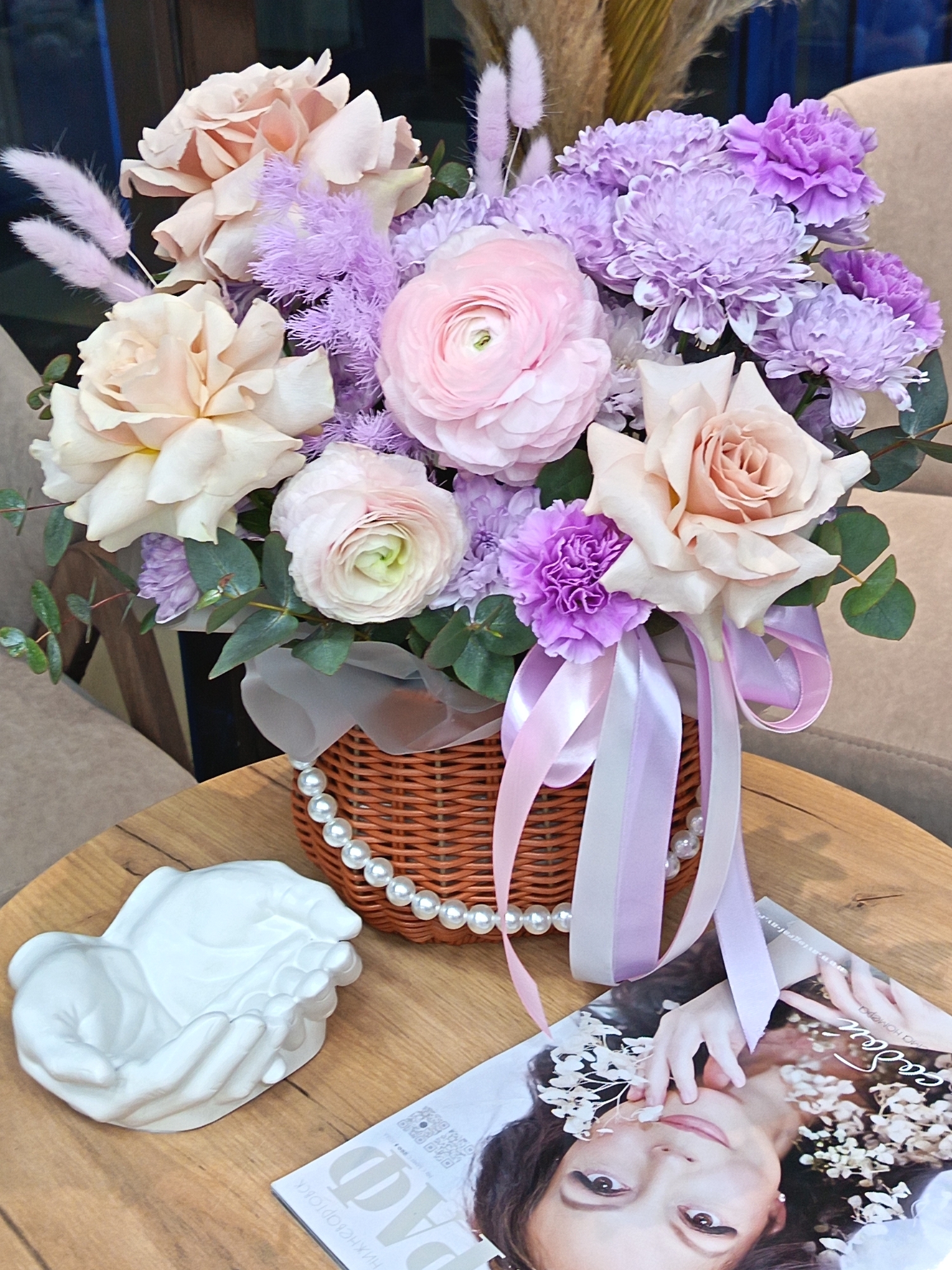 The image depicts a floral arrangement in a woven basket adorned with a pearl strand and ribbons