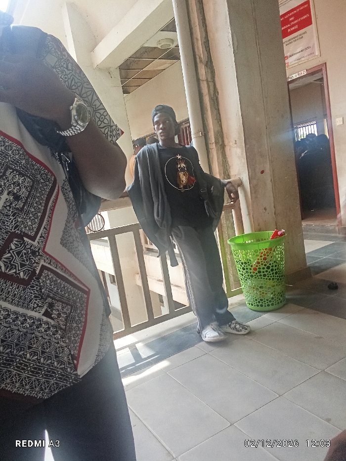 A person in a black cap, t-shirt, and grey pants leans against a railing. There's a green trash bin to the right. Part of another person is visible on the left, wearing a patterned shirt and watch. The setting appears to be a tiled balcony or corridor, with an open doorway in the background. The image is taken indoors and is a bit blurry.