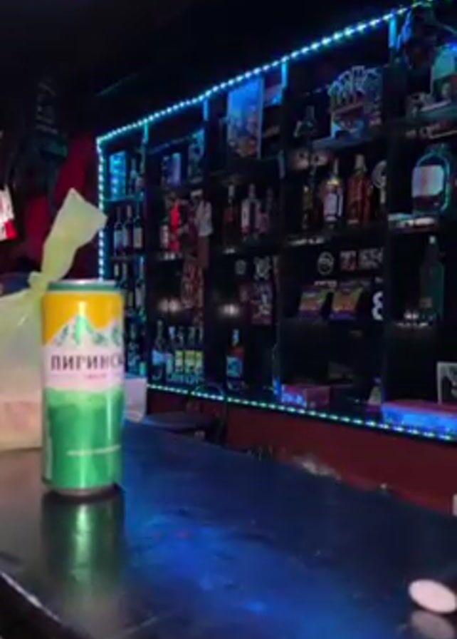 can of Pirinsko beer on a bar counter. The background features bar shelves stocked with bottles, illuminated by color-changing LED lights. The light colors change from green to purple to red. A plastic bag sits next to the can. A disco ball can be seen on the ceiling.