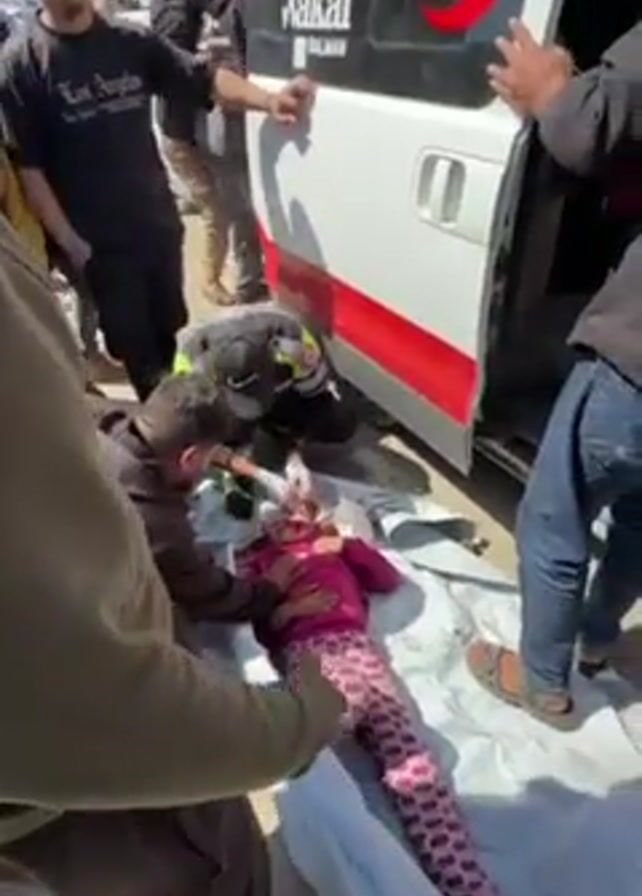 what appears to be the aftermath of an incident involving a young girl, possibly an accident or attack, as suggested by the presence of medical personnel and an ambulance. The girl, dressed in patterned leggings and a pink top, is lying on a white sheet on the ground. Medical personnel are attending to her, focusing on her head where there seems to be a significant injury. There is blood visible around her head and on her clothing. Several people surround the scene, some observing and others possibly providing assistance. The ambulance is parked nearby, partially open, with the name of a charitable organization, "DOMPET DHUAFA" along with "wakaf SALMAN" inscribed on its side. The surrounding environment suggests an urban area, with building debris visible in the background. The tone is urgent, reflecting the seriousness of the situation as medical personnel work to provide care. The sounds of an ambulance siren are audible throughout the video.