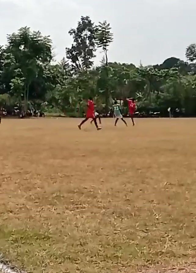soccer game being played on a dry, grassy field with sparse green patches. Several players in red jerseys are running towards the right side of the screen, while other players in green and white jerseys are attempting to defend. There is one player in a yellow jersey. Trees are visible in the background, and some people are watching the game from the sidelines. The camera is at ground level and follows the action as the players move around the field.