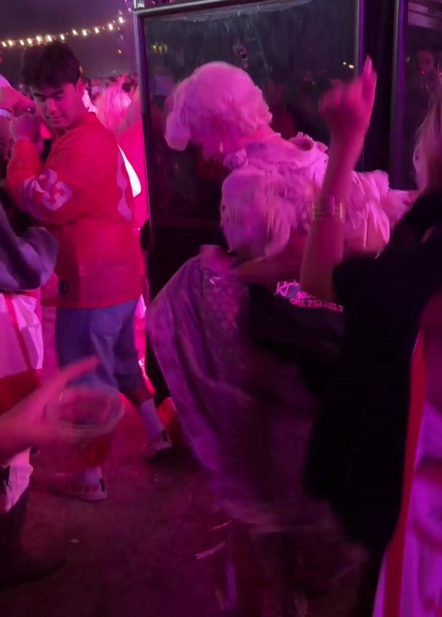 The video captures a lively party scene, illuminated by pink lighting. A person in an elaborate, frilly white outfit, possibly a costume, falls backwards, flailing their arms and legs. The surrounding crowd includes a man in a red jersey, a person carrying a striped bag, and others holding drinks. A mirrored surface reflects the scene, adding to the visual complexity. The atmosphere is energetic and chaotic.