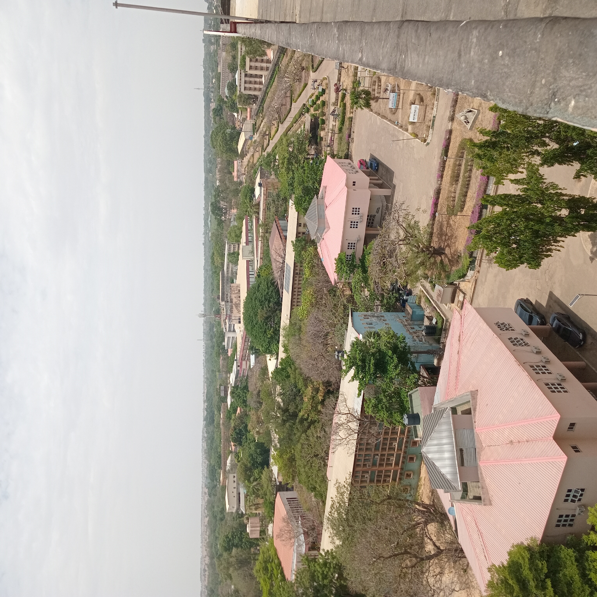 This is an aerial view of Jama A, Nigeria, showing buildings, trees, and infrastructure under a hazy sky. Buildings with pink roofs are prominent in the foreground and middle ground. Other buildings are scattered throughout the scene, varying in size and architectural style. Green foliage covers a significant portion of the landscape. A few vehicles can be seen parked near buildings. The scene is taken from a high vantage point, likely a tall building or structure.