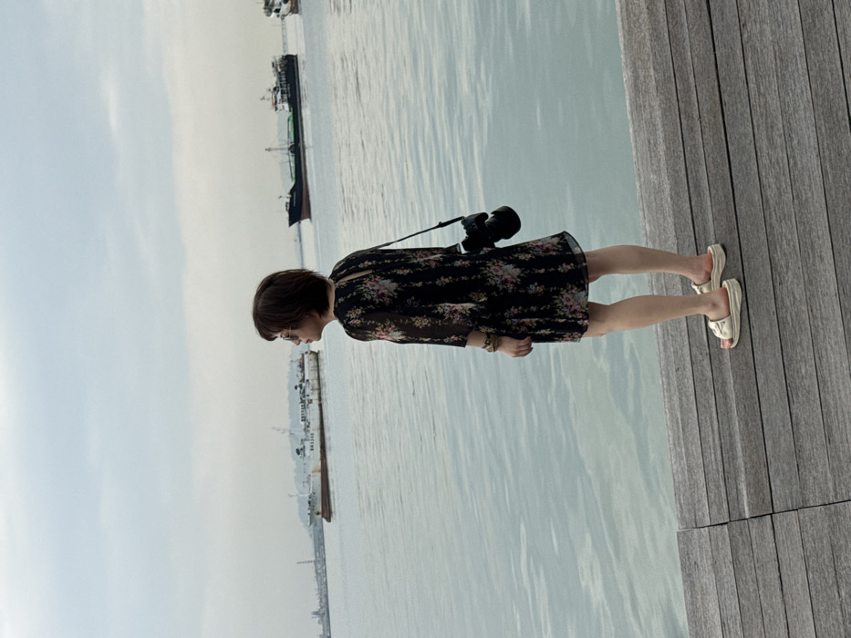 A woman wearing a floral dress and sandals stands on a wooden deck, facing the water. A camera hangs from her shoulder. Several ships are visible on the horizon. The sky is overcast and pale. The water appears calm and reflects the sky's color. The deck's wood planks run parallel to the frame's right edge, creating a textured foreground.