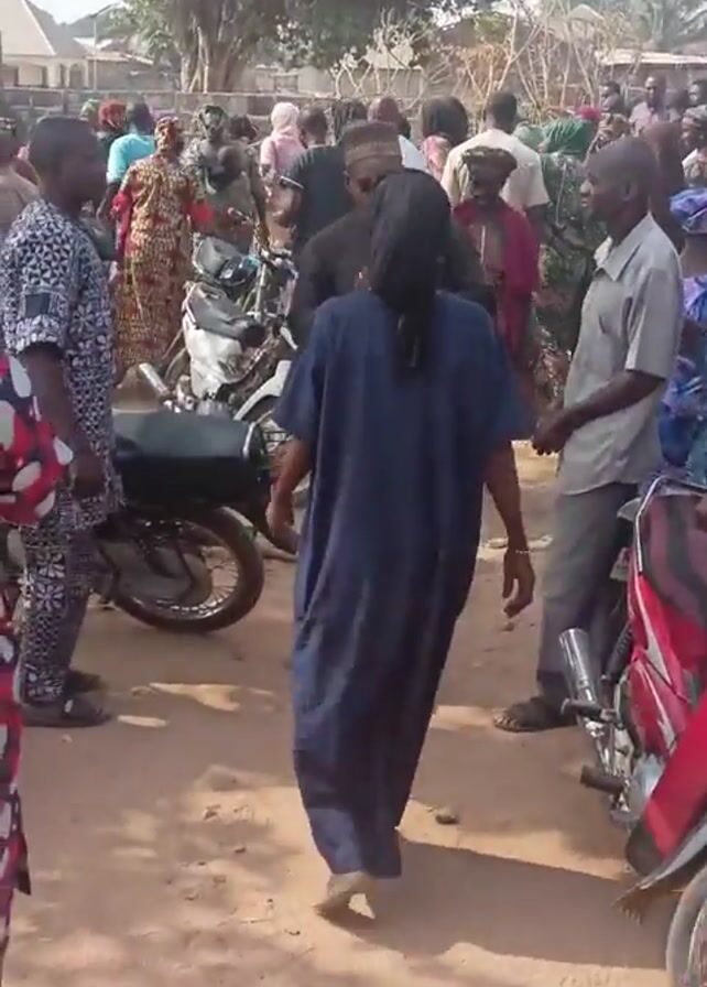 large group of people gathered in what appears to be an outdoor event. The ground is dirt or sand. People are wearing a variety of clothing, including traditional African prints and modern attire. Several motorcycles are parked amongst the crowd. A tree provides shade in the background. The crowd seems to be milling around, and the atmosphere appears communal.