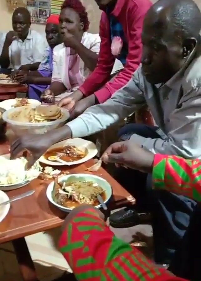 A group of people are gathered around a wooden table, eating a meal together. The table is laden with plates and bowls of food. The people are of varying ages and are dressed in casual clothing. The room appears to be a home dining area. The atmosphere seems convivial. They are helping themselves to food from serving dishes on the table. One person is wearing a red and green patterned shirt, and another is wearing a pink top with red hair. There is a window with bars visible in the background.