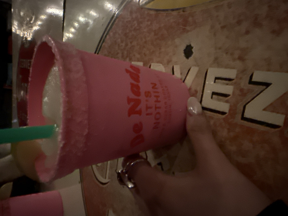 A pink cup with the words "De Nadi" and "IT'S NOTHIN'" printed on it is held in a person's hand. The cup is rimmed with sugar and filled with a white, frozen beverage. A green straw sticks out of the drink. The backdrop showcases large, illuminated white letters against a textured, reddish-brown surface, possibly a wall or a sign. The person's hand and ring are partially visible.