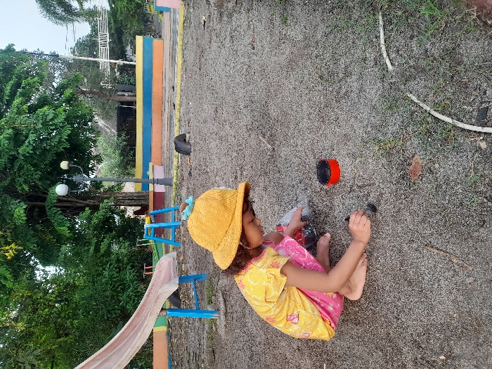 A young child wearing a yellow hat and a colorful dress is sitting on a sandy surface, possibly a playground. The child is engaged in play, holding toys in their hands. A red container sits nearby. In the background, there's a playground structure with a slide and colorful painted barriers. Trees and a light post are also visible, suggesting an outdoor public space. The photo seems taken from a high angle.