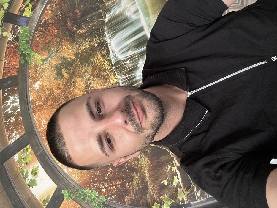 A photographic portrait depicts an adult male in an indoor setting within the city of Slavyani, Bulgaria. The subject, positioned centrally and facing forward, has short, dark, buzz-cut hair and a short, dark beard. He possesses light brown eyes and a neutral expression with a slight upward curve to his lips. He is wearing a black short-sleeved polo shirt with a collar featuring a thin white stripe. A silver zipper extends from the collar's base down the front of the shirt. The background consists of a large wall mural illustrating an autumnal forest scene with a vibrant orange and brown canopy. A multi-tiered waterfall is visible on the right side of the mural, alongside a decorative archway adorned with green foliage on the left.