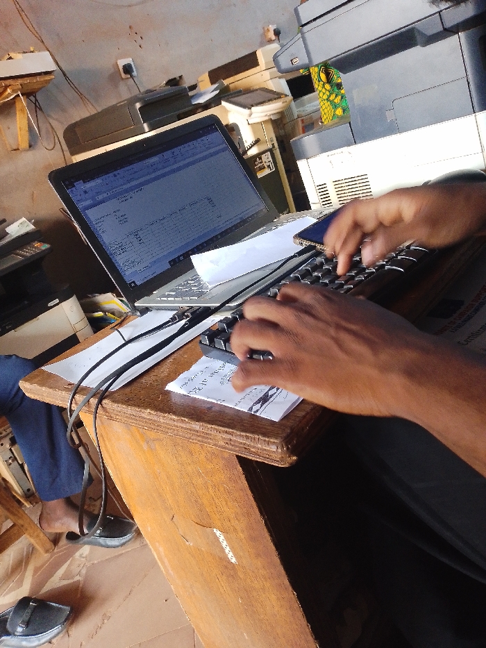 An indoor scene depicts an individual seated at a worn wooden desk, actively typing on a black external keyboard. Two dark-skinned hands are positioned over the keyboard, with the right hand partially obscuring a dark-colored smartphone standing upright on the desk. A silver laptop is open on the desk, displaying a spreadsheet application with visible data rows and columns. A folded white paper rests on the laptop's keyboard area. Black cables extend from the external keyboard across the desk. A small piece of white paper with handwritten text is positioned under the left hand on the desk. The individual's lower legs are visible under the desk, clad in blue trousers, with one foot wearing a black flat shoe and the other partially obscured. The desk's front face shows a crack repaired with white tape. In the background, a light-colored wall with visible electrical outlets and plugs serves as the backdrop. Multiple printing and copying machines are present: a large, dark gray multifunction printer/copier with a green, yellow, and black patterned fabric piece inserted, and several other smaller printers and electronic devices stacked or positioned on shelves. The lighting suggests a mix of natural and artificial sources, casting some shadows. The setting appears to be a functional office or commercial establishment offering computer and printing services in an unknown city.