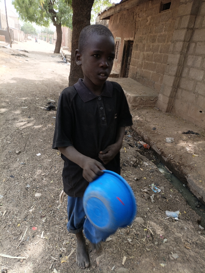 A young Black boy, estimated to be between 7-9 years old, stands barefoot on a dry dirt path in the city of Zango, Nigeria