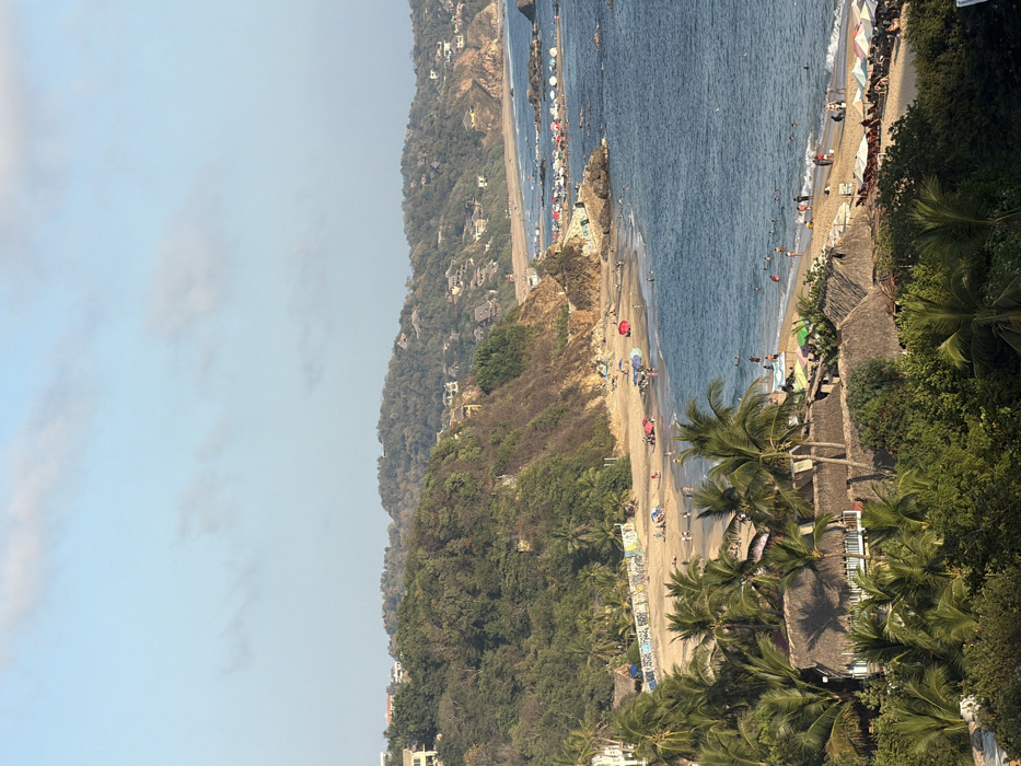 A coastal landscape with a long, sandy beach curving along the edge of a bay. People are scattered along the beach near the water, with many colorful umbrellas. Green, forested hills rise beside the beach, dotted with buildings and houses. The blue water of the bay fills a large portion of the scene, contrasting with the green of the hills and the sand of the beach. Palm trees are visible in the foreground.