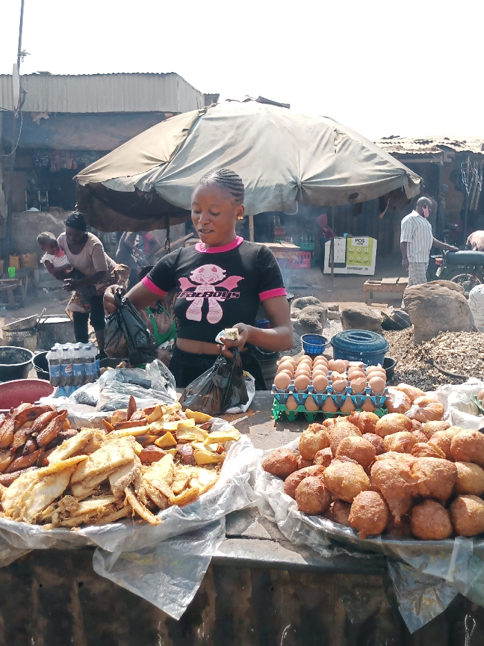 The image displays an outdoor market scene in Rido, Nigeria, under daylight conditions. In the foreground, a female vendor with braided hair, wearing a black crop top with pink trim and a "FatBOYS" graphic, stands behind a makeshift counter. She is holding a small, light-colored item in her right hand and a black plastic bag in her left. The counter is laden with various food items: a significant quantity of fried plantain or yam slices on the left, an adjacent pile of fried yam or potato wedges, two cartons of brown eggs on a plastic tray, and a large mound of deep-fried dough balls on the right. Several bottles of Pepsi are visible behind the fried items. In the midground, a large, light-colored market umbrella shades the primary vendor's stall. To the left, a woman wearing a light-colored top is seen carrying an infant on her back, partially obscured, near large cooking pots. To the right, a male individual in a striped shirt and checkered shorts stands near a dark-colored motorcycle. A "POS here" sign is visible behind the male individual. The ground consists of dirt and scattered rocks. The background features simple market structures with corrugated metal roofs and walls, with visible haze or smoke in the air.