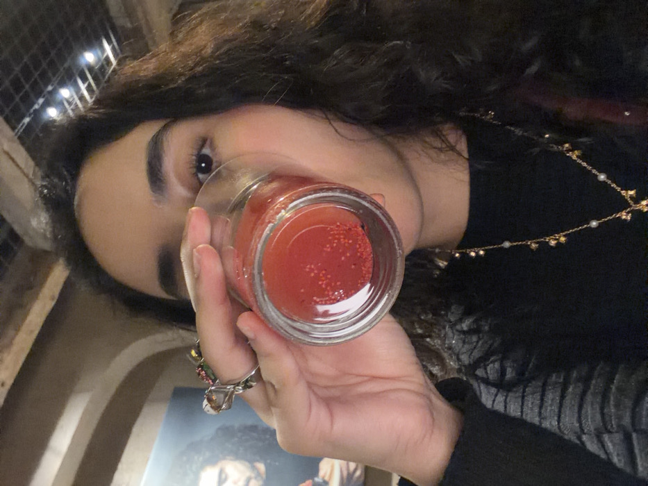 A person with dark curly hair is holding up a clear glass jar filled with a red liquid. The liquid appears to have small red seeds or particles suspended in it. The person is wearing a dark-colored top, a delicate gold necklace, and a large ring with multiple stones. The jar is positioned in front of their face, obscuring part of their mouth. The background is softly lit with neutral tones and some decorative lights.