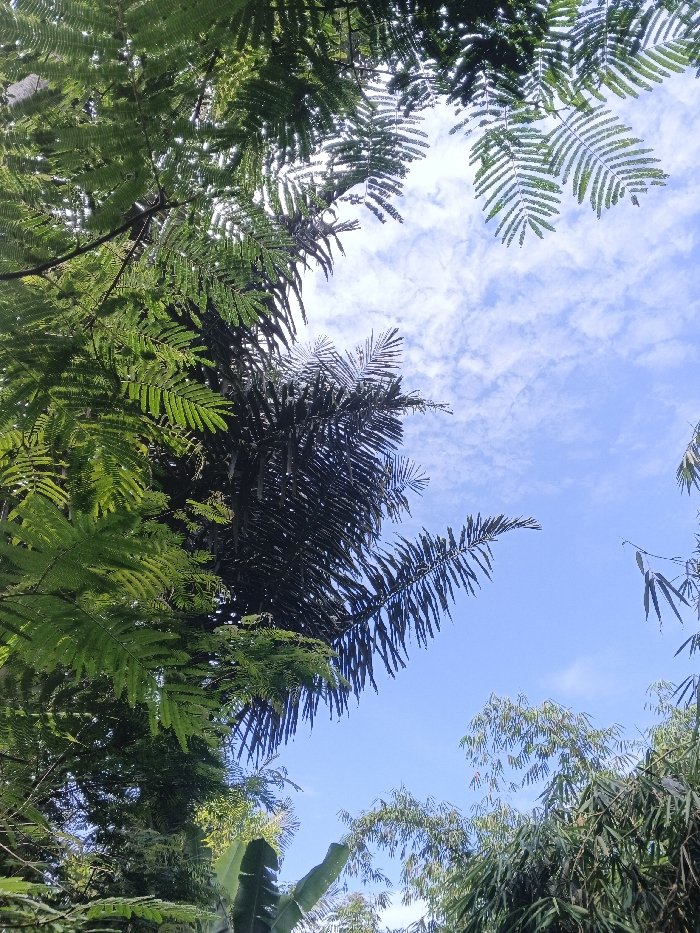 A vibrant canopy of green foliage frames a bright blue sky dotted with scattered clouds. Various tree types are visible, including fern-like leaves and palm fronds, creating a dense, layered perspective. Below, glimpses of banana leaves and bamboo hint at a lush undergrowth, capturing a serene natural setting.