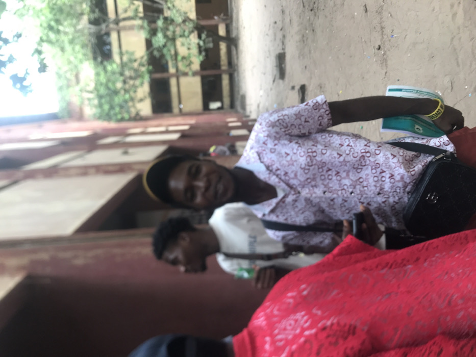 The image depicts an outdoor scene in Ihiagwa, Nigeria, featuring three individuals against a backdrop of institutional buildings