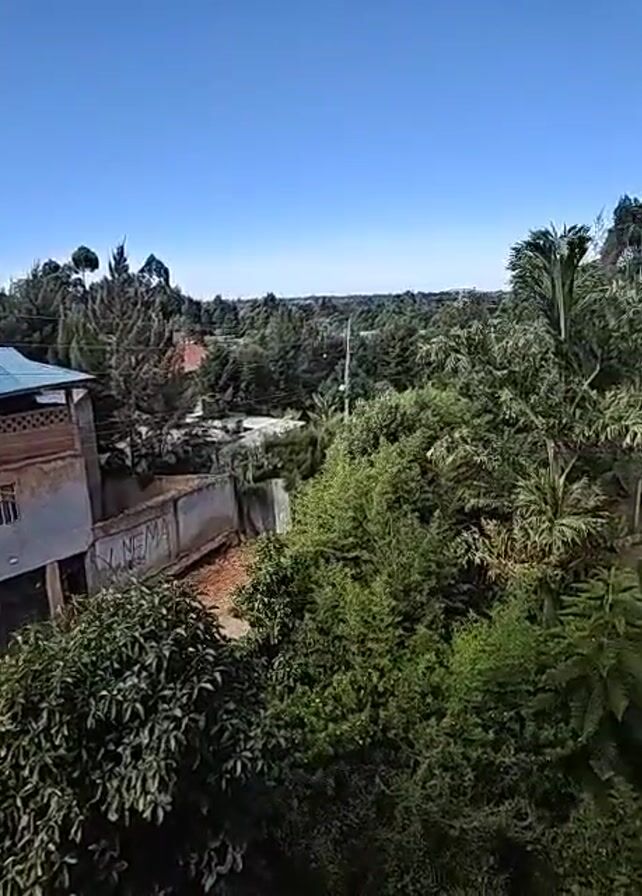 wide shot of a residential area with a variety of trees and greenery against a clear blue sky. The camera pans slightly to the right, revealing more of the landscape. In the foreground, there is a building with a blue roof and a concrete wall with the word "NEMA" written on it. There are also several lush trees and bushes. In the background, there is a wide expanse of trees and other buildings, stretching out towards the horizon. The scene is well-lit and the overall impression is one of a peaceful, suburban environment.
