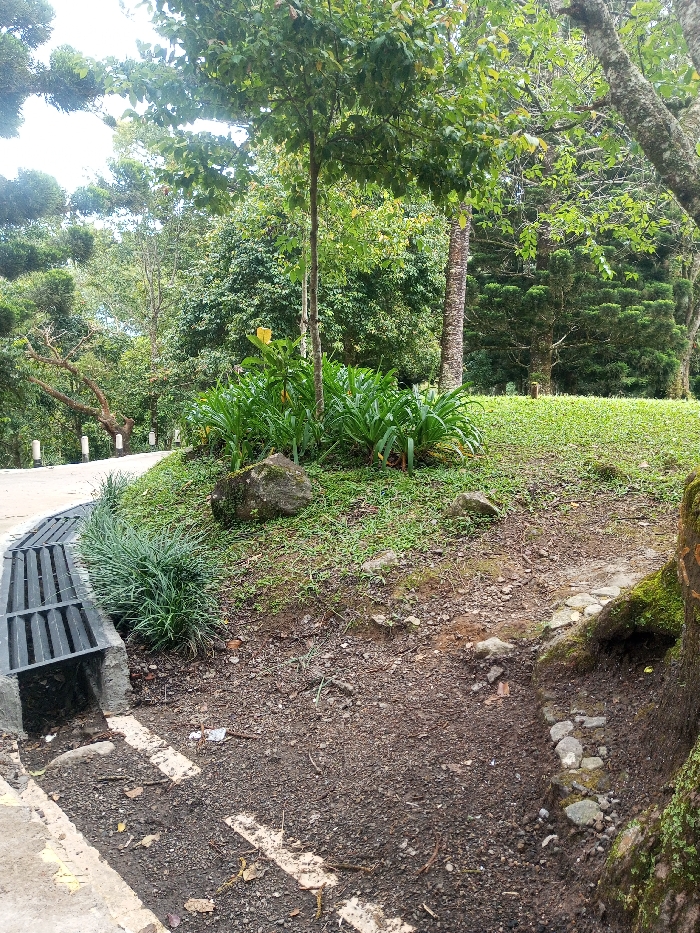 This image depicts an outdoor, vegetated scene in Padegaon, India. The foreground features a concrete paved surface with a black metal storm drain grate running along its left edge. Adjacent to the pavement is a strip of dark, disturbed soil mixed with small stones and sparse dry debris. To the right, a gently sloping grassy mound is present, dotted with several moss-covered rocks and clusters of broad-leaved green plants, one displaying a single yellow bloom. A medium-sized tree with green foliage stands centrally on this mound. The background is dominated by dense, lush green vegetation, including multiple trees of varying heights and species, some with visible trunks and branches. A large tree trunk, partially covered in moss, is visible in the extreme bottom right corner. On the far left, a curved paved path recedes into the distance, lined by several white bollards or small posts. No individuals or animals are present. The lighting suggests daylight conditions, possibly overcast.