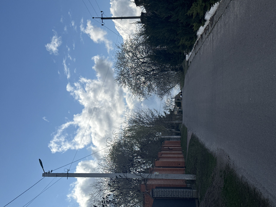A view down a paved road in Kriukivshchyna, Ukraine, with a brick wall on the left side. There are trees on both sides of the road. The road appears to be empty, except for a few people in the distance. The sky is blue with white clouds. There are power lines running along the road, with poles on both sides. The streetlight on the left is on. The road curves slightly in the distance. The brick wall is made of red bricks. A white curb separates the grass from the road.