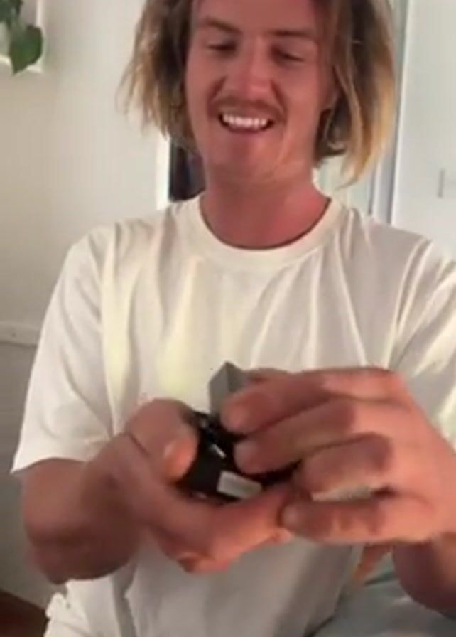 A young man with medium length brown hair and a mustache smiles broadly and opens a small black box, revealing a piece of jewelry inside