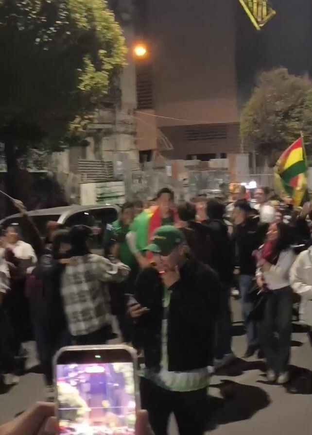 At night, a large crowd celebrates on a city street, waving Bolivian flags. Most people are in their teens or twenties. A few people are filming the event with their phones. The camera filming the video is doing the same. One man wears a Bolivian flag like a cape. Some people wear green shirts. A building in the background has a large lit logo. Trees line the street.