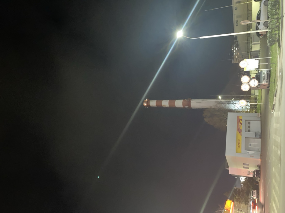 An industrial landscape at night features a tall chimney with red and white stripes dominating the view. The chimney stands beside a service station, indicated by signage, and a cluster of traffic signs. A bright streetlight illuminates the scene, with vehicles passing by on the right side of the frame. The backdrop is a dark, hazy sky, adding to the urban, industrial atmosphere.