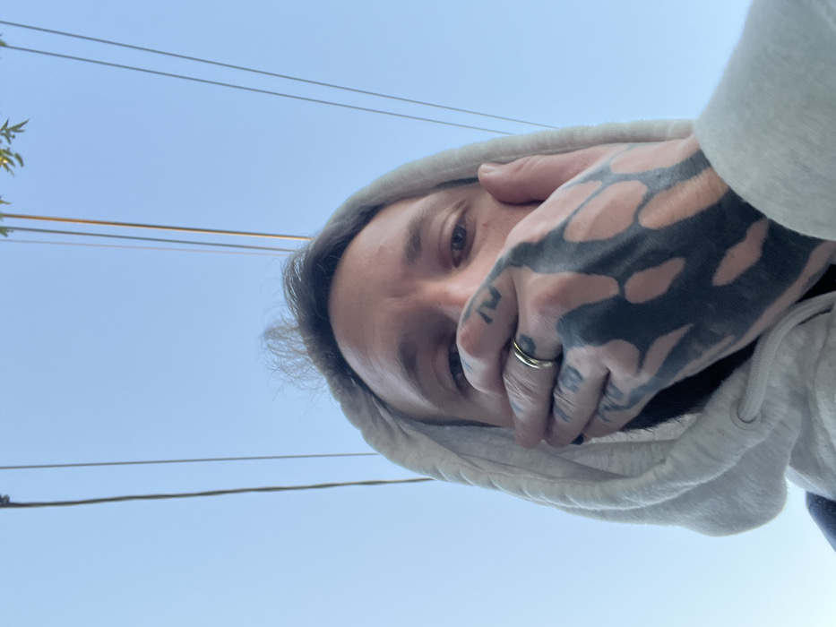 A low-angle, close-up image captures an individual, likely male, against a clear, light blue sky in Cordoba, Argentina. The subject's face is partially obscured by their right hand, which covers the mouth and chin. The hand is heavily tattooed with dark, organic patterns that leave areas of lighter skin visible, and a plain metallic ring is worn on the fourth finger. The individual is wearing a light-colored hooded sweatshirt with the hood raised, framing their face. Dark hair is visible above the forehead. Multiple thin, dark overhead wires traverse the upper background, with faint green foliage discernible in the upper right quadrant. The subject's eyes are open and directed towards the camera.