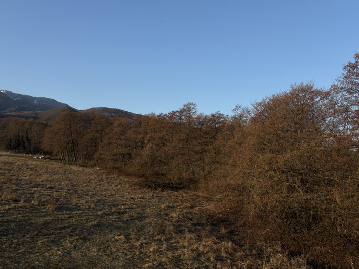 The image depicts an outdoor landscape in the city of Dolna Banya, Bulgaria, under a clear, light blue sky. The foreground comprises an expansive field of dry, light-brown grass, marked by long shadows indicative of low-angle sunlight, suggesting either early morning or late afternoon. In the midground, a dense, continuous line of leafless deciduous trees and shrubs presents a range of brown and dark reddish-brown tones. A small group of indistinct white-colored animals, consistent with sheep or goats, is visible grazing at the far-left edge of the grassy field, at the base of the treeline. The background features additional distant treelines and mountain ranges, with several peaks displaying patches of snow. No human figures or direct human actions are present.