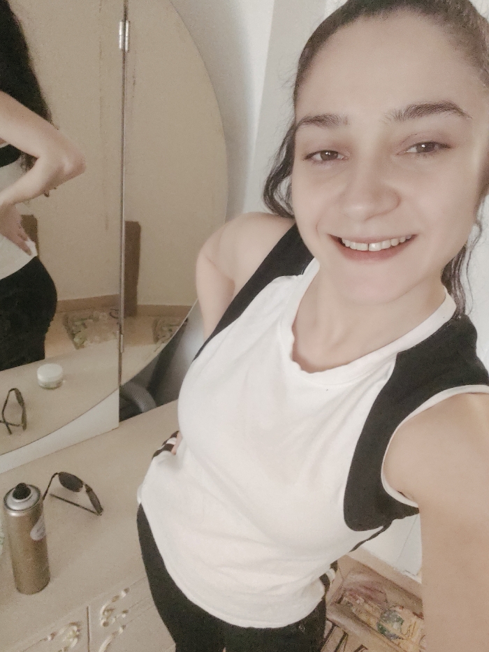 A female subject is captured in a mid-shot selfie, smiling directly at the camera. She wears a white sleeveless top with black side panels and dark-colored bottoms. Her dark hair is pulled back, partially visible. She is positioned in front of a light-colored dressing table or vanity with decorative carvings, on which a rounded mirror reflects her back and left side, showing her left hand placed on her hip. On the surface of the dressing table, to the left of the subject's reflection, rests a small, light-colored circular jar with a lid, and a pair of dark-framed sunglasses. Further to the left, a metallic aerosol can stands upright. The background visible in the mirror's reflection shows a light-colored wall and a portion of a patterned rug on the floor. The scene is indoors. No discernible features within the image indicate the specific location within the city of Ghent, Belgium.