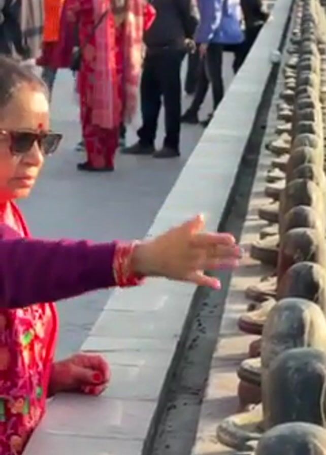 woman with sunglasses, wearing a pink top and a red and pink shawl, facing a row of dark stone objects. She is standing behind a concrete ledge and facing the objects, making a hand gesture with both hands, seemingly in a respectful or worshipful manner. Behind her, a group of people of varied ages and attire are walking, standing, or milling about on a sunny day. The stone objects are arranged in a linear fashion and appear similar in shape.