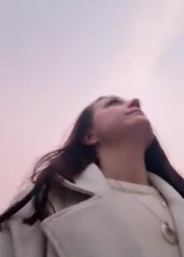 A young woman with long brown hair, wearing a light-colored coat, is seen from a low angle against a pale pink and cloudy sky