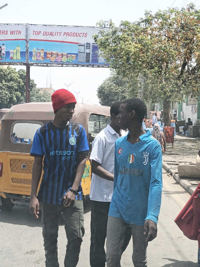 The image depicts an urban street scene in Hotoro South, Nigeria, under bright daylight. Three males are positioned in the foreground. The leftmost male wears a red knitted beanie, a blue and black vertically striped short-sleeve football jersey with "betsson sport" and an Inter Milan logo, and dark green cargo pants; he looks towards the right. Adjacent to him, a male wears a light blue long-sleeve football jersey featuring an Italian flag shield logo, three stars, and "Jeep" text, paired with grey jeans; he looks towards the right. A third male, partially visible between and behind them, wears a light-colored short-sleeve button-up shirt and dark pants. To the left, a brown and yellow three-wheeled auto-rickshaw is present. Overhead, a large billboard displays "TOP QUALITY PRODUCTS" alongside images of various beverages and electronics. The environment includes paved ground, green trees with light foliage, and distant buildings on the right side of the street, where several blurred figures and red containers are visible.