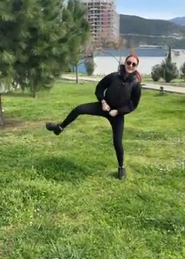 A woman in a black vest, sunglasses, and leggings is outside doing stretching exercises on a grassy area on a sunny day. She is facing the camera and moving her right leg in front and to the side. There are trees and a building in the background.