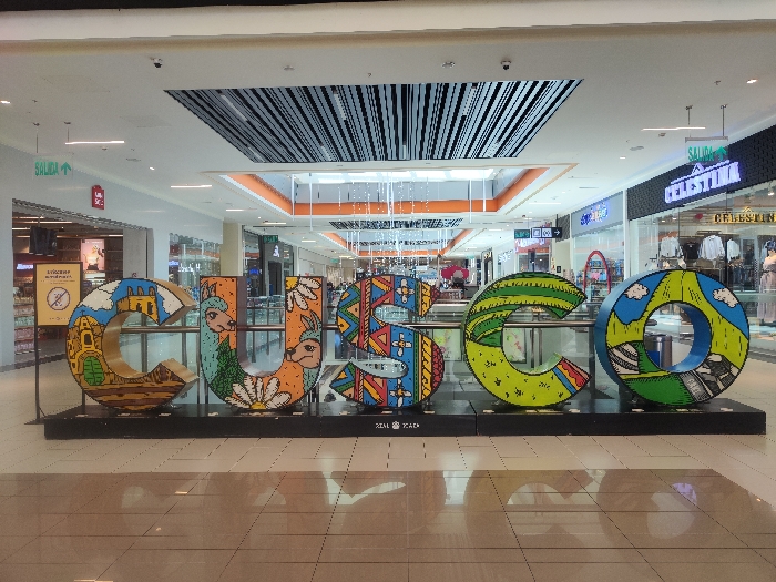 A large, colorful "CUSCO" letter-sign occupies the foreground of a brightly lit, modern shopping mall interior in Cuzco, Peru