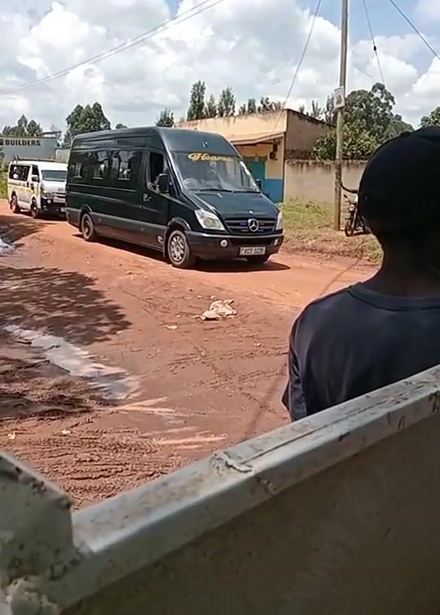 The scene captures two vans driving down a muddy road. The foreground shows a person wearing a black shirt and cap, facing away from the camera, partially obscured by a grey metal fence or railing. In the middle ground, a dark green Mercedes-Benz van is seen driving on the muddy road, followed by a white van further behind. The backdrop includes a building with a sign that reads "BUILDERS," utility poles, trees, and a sky with scattered clouds. The road surface appears uneven and partially covered with puddles. The perspective suggests the video is taken from inside a vehicle or structure.