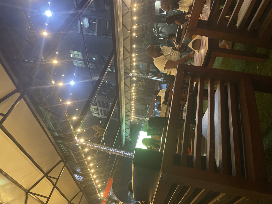 An outdoor restaurant at night shows people seated at tables with wooden chairs. String lights illuminate the scene, hanging from the roof. Buildings are visible in the background, and the restaurant has a modern, open-air design. A ceiling fan is seen. Artificial grass covers the ground. The overall atmosphere appears relaxed and social.