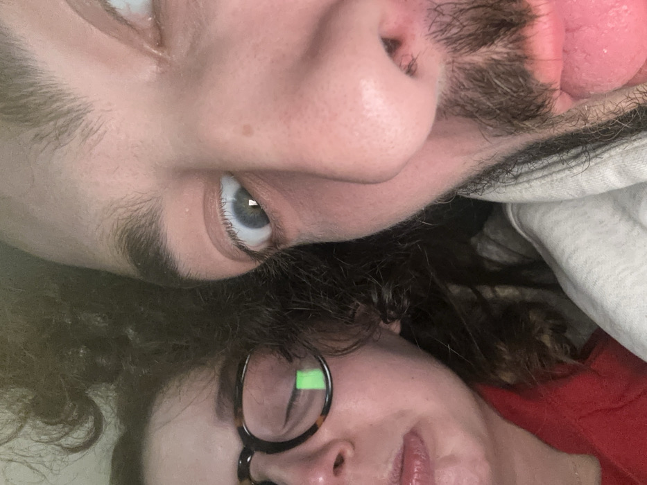 A close-up, angled selfie featuring two people. One person, with light skin, a prominent nose, a blue eye, and a dark eyebrow, appears upside down relative to the frame. A portion of a beard and a partially visible tongue are present. The other person, with curly dark hair and glasses, is positioned below, face partially visible. They are wearing a red top. The backdrop includes a white garment, adding depth to the image.
